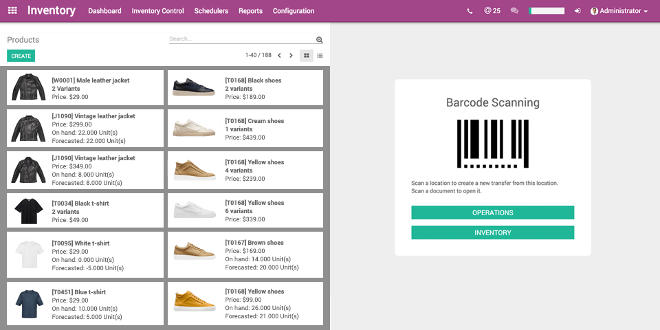 The Odoo inventory app automatically gathers any transaction from purchase orders, sales orders, the webshop or from the POS, and processes it through the inventory. You can see the availability of products in real time without losing time investigating. Move stock from one location to another simply by scanning products and locations.